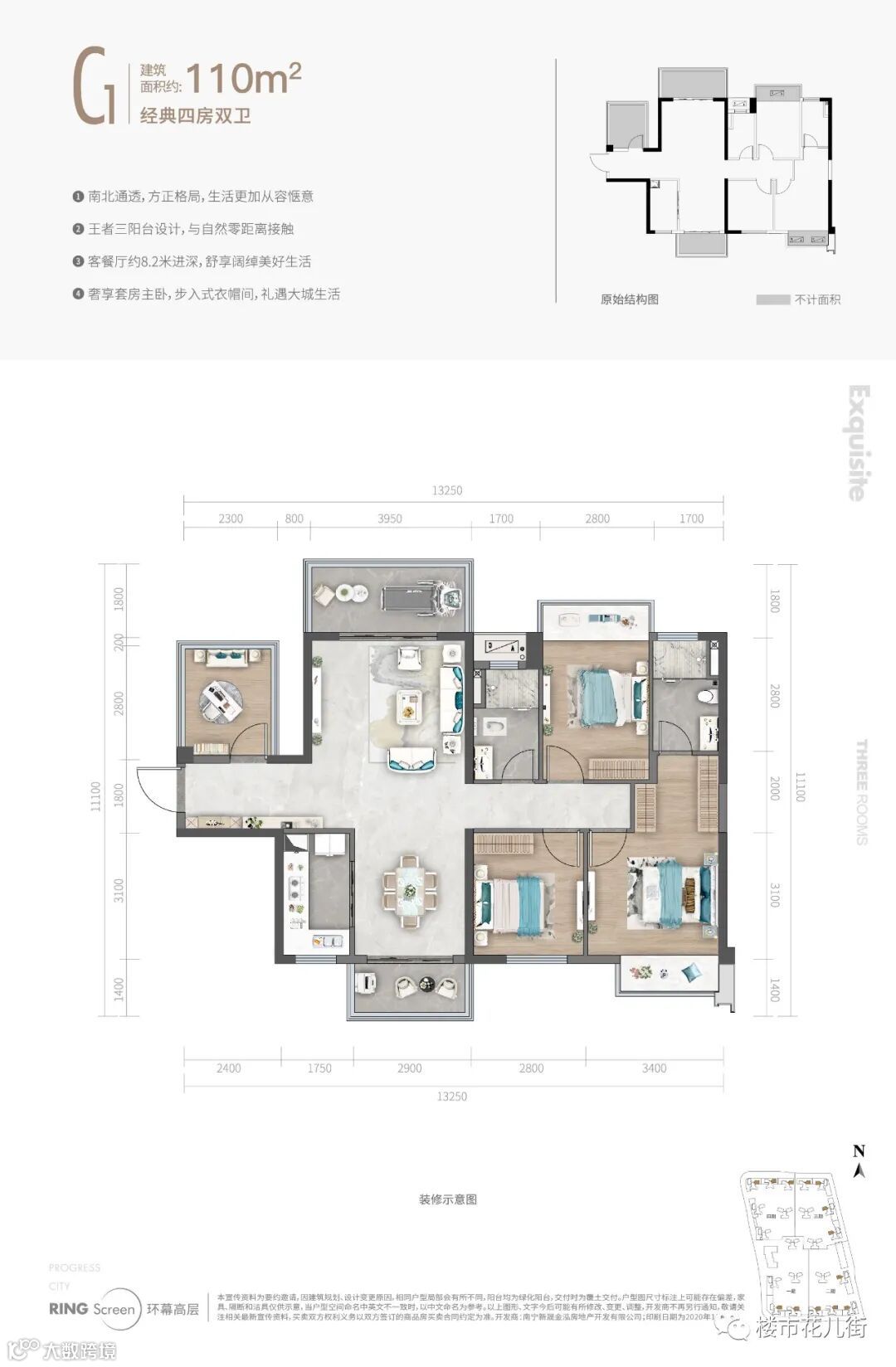 再看看这个110㎡的四房两厅两卫,又是一个在同等面积段里,能胜出的户型。
