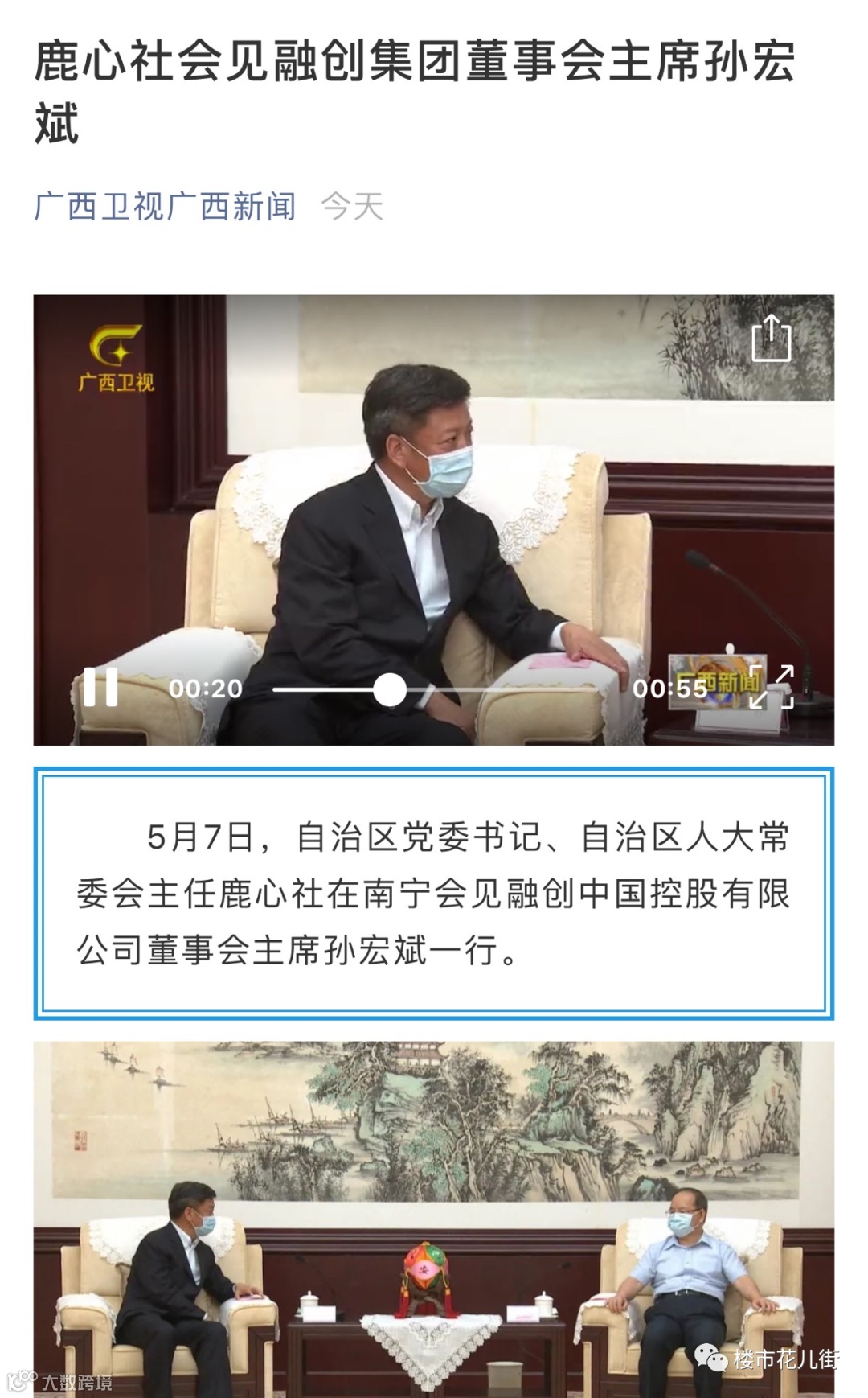 今天广西卫视发布了一条重磅新闻:广西壮族自治区党委书记、自治区人大常委会主任鹿心社在南宁会见融创中国控股有限公司董事会主席孙宏斌一行。