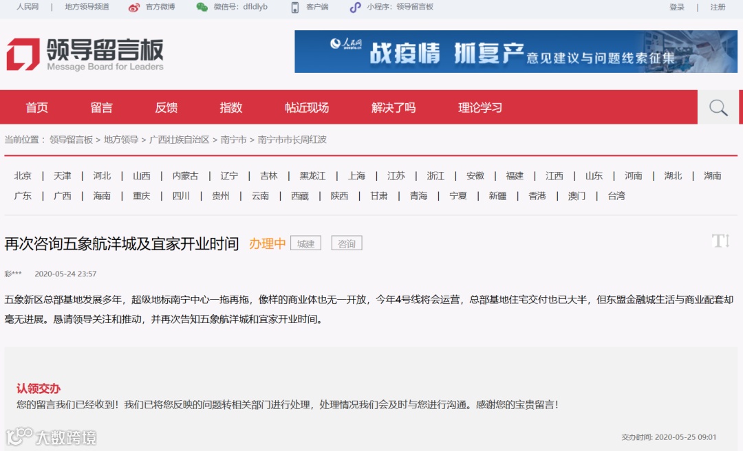 当然,盼着宜家快快开业的业主坐不住了。花儿姐在人民网领导留言板下看到,上个月的24日,有人留言咨询宜家何时开业等问题。但是并没有看到十分明确的答复。