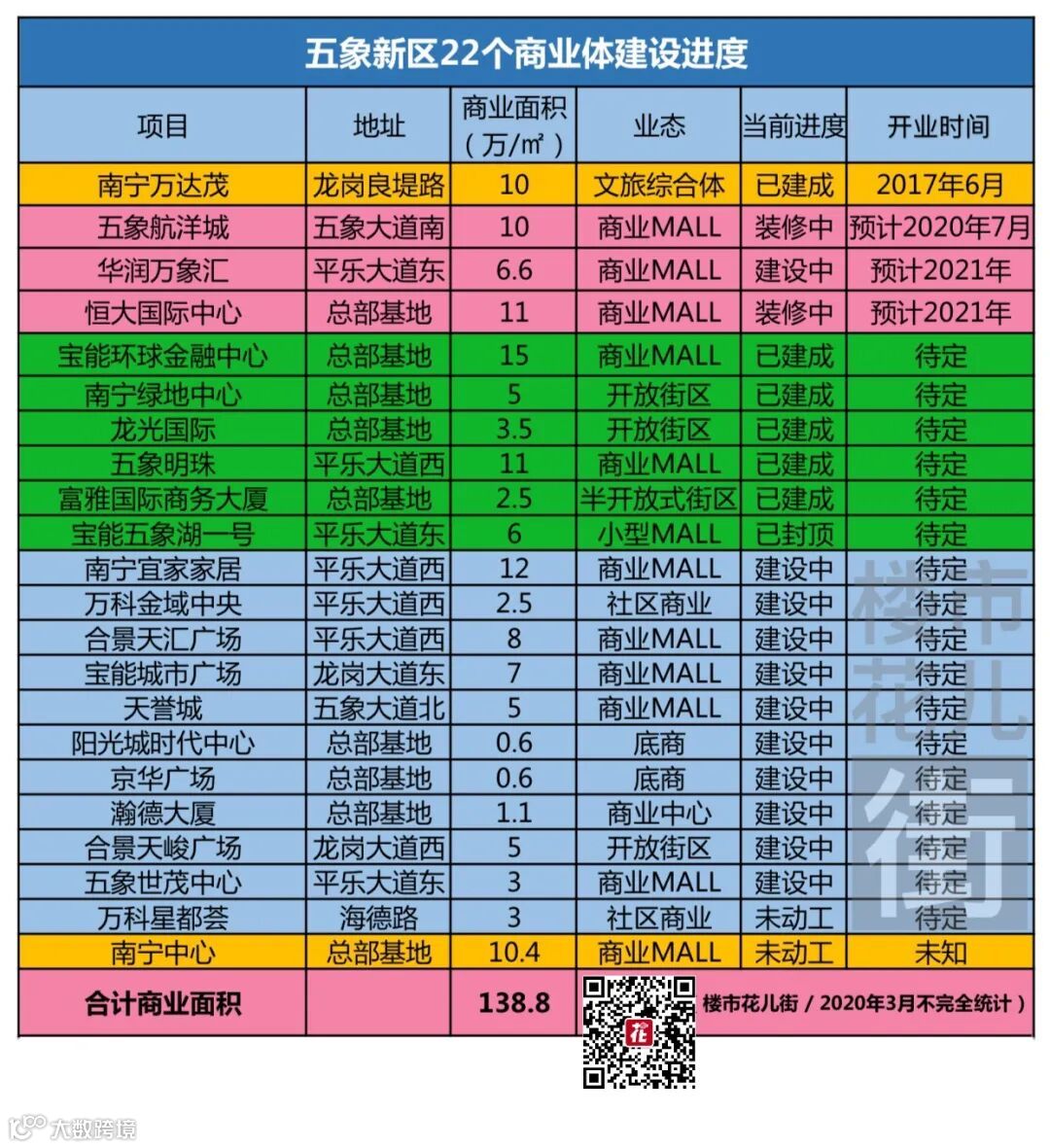 这张图,基本涵盖了五象新区的商业或者商业综合体。这些五象新区小、中、大型商业体量超过130+万㎡,项目超过22个,小型的社区底商不在统计范围。