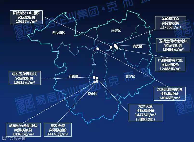 还记得去年南宁市卖的最贵的几块地吗?基本上都集中于五象湖。2019年南宁市成交的9幅楼面价过万的地块中,其中价格最高的4幅就处于五象湖。其中,价格最高的龙光天瀛项目地块,实际楼板价达到14478元/平方米,土拍当日竞拍轮次达到200多轮,数十家房企蜂拥而抢。