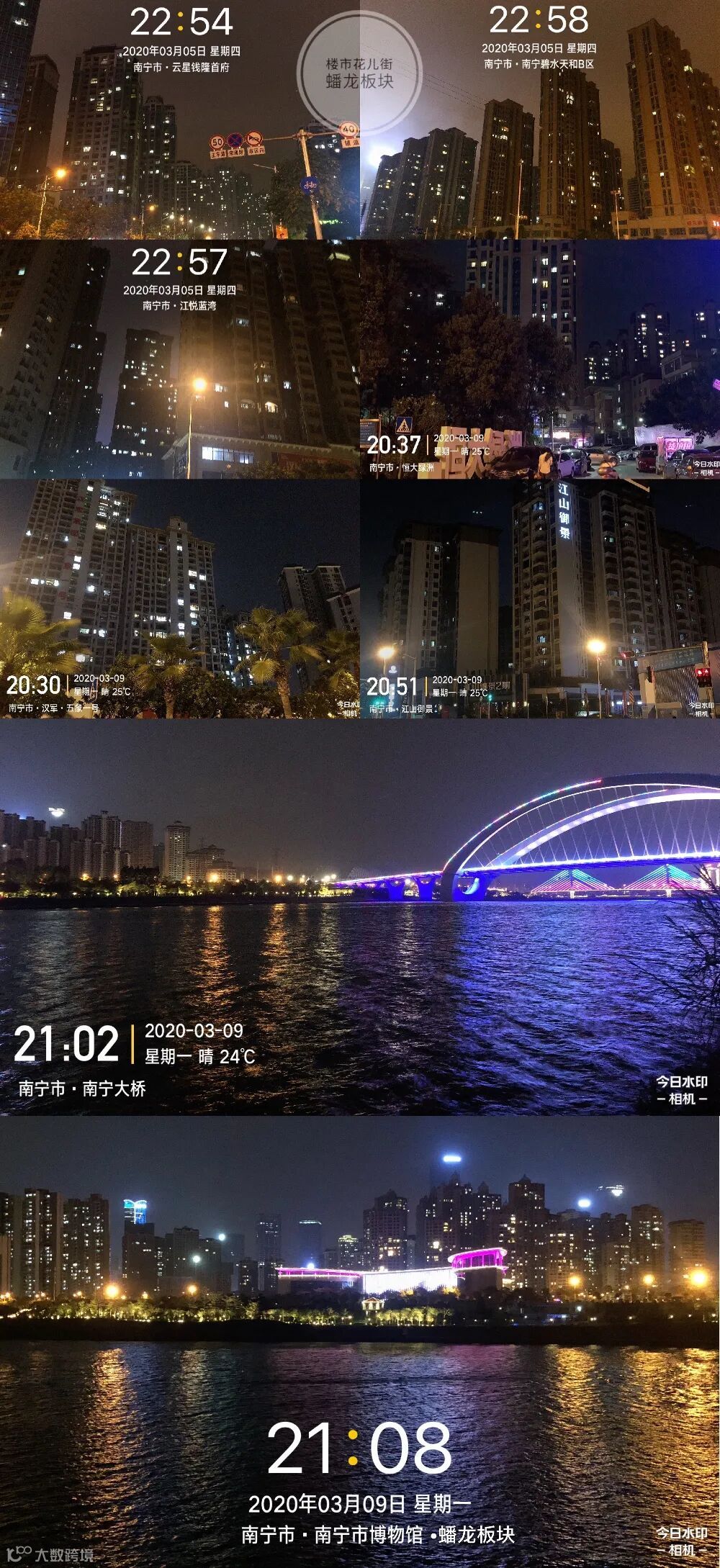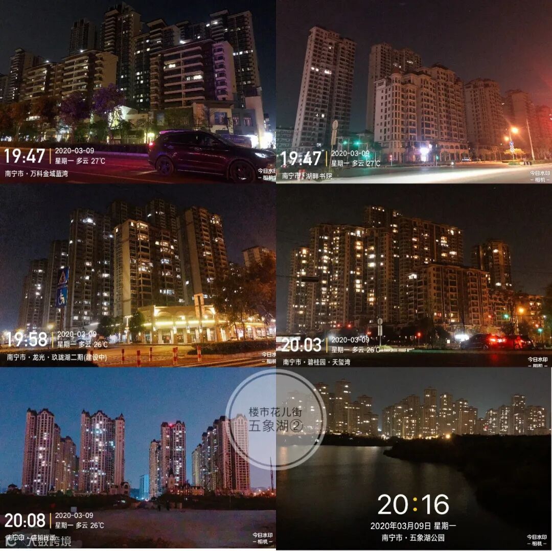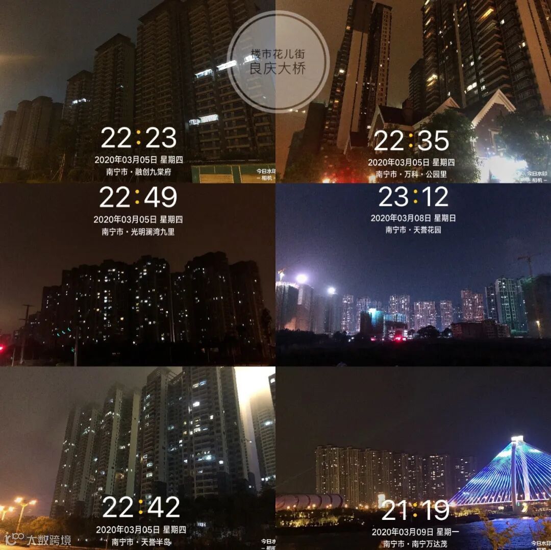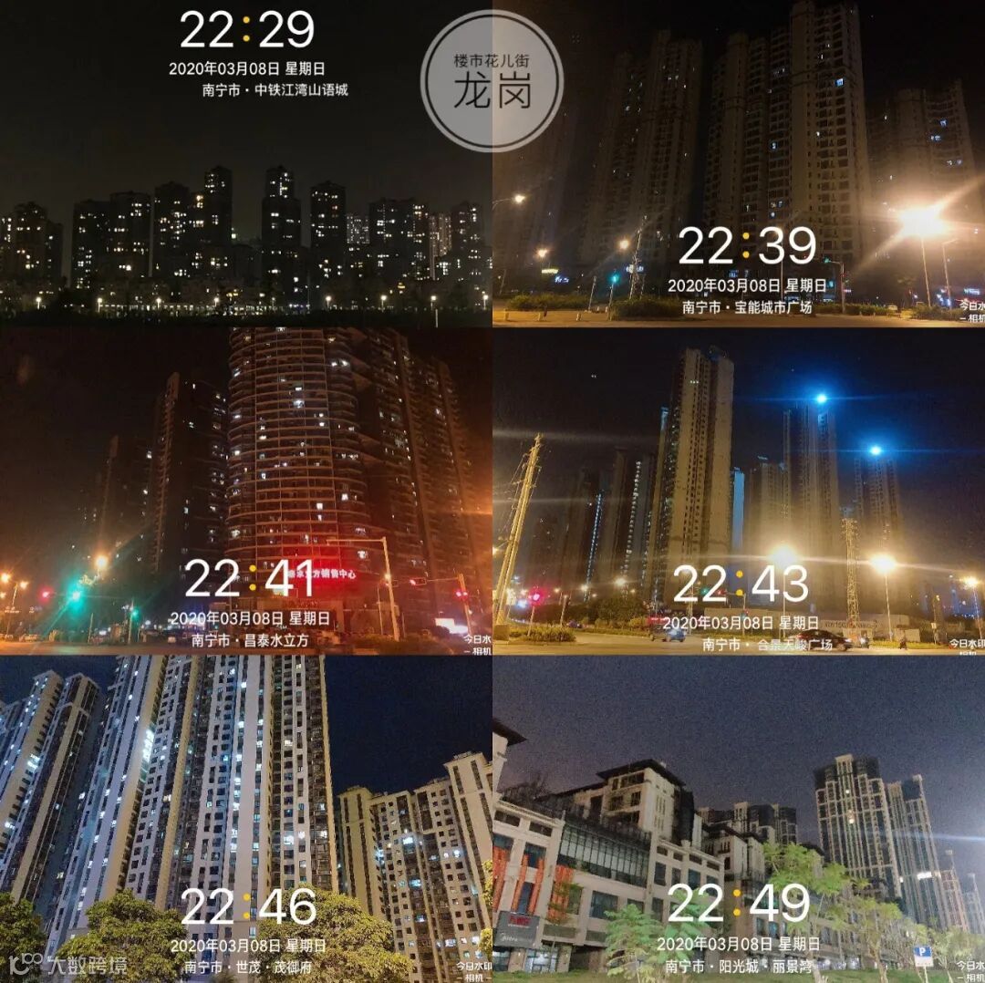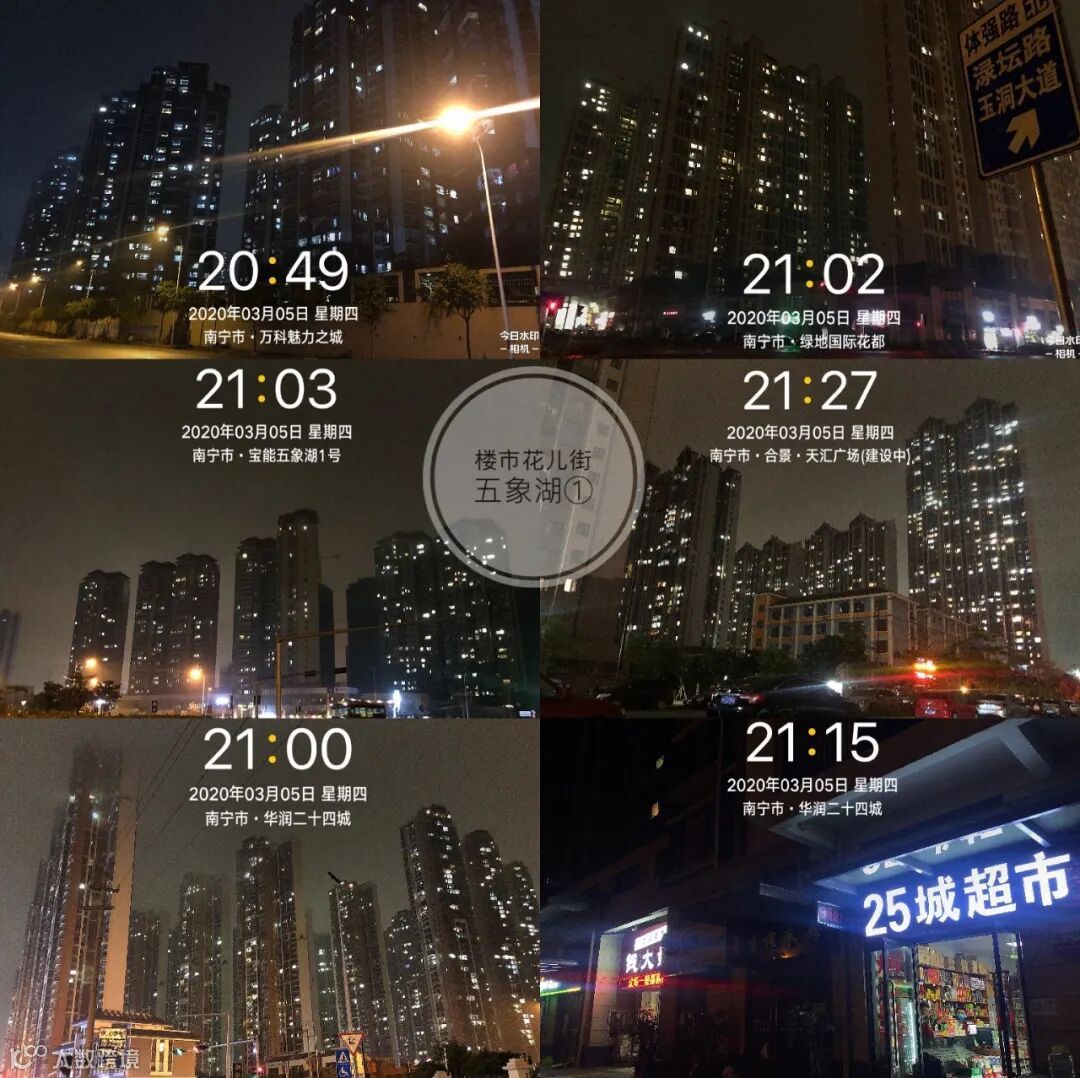 花儿街特地乘着大家被疫情困在家、没有外出过夜生活的3月5日、8日、9日,3个晚上夜拍五象新区“亮灯率”,拍摄楼盘达29个。