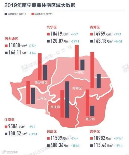根据克而瑞日前公布的数据,2019年,仅良庆区的商品住宅成交面积就达到408万平方米,占比已经超过全市的3成,而再加上邕宁区的成交量,整个五象新区的成交面积达到523.82万平方米,占全市总成交量1153.7的45%,接近一半。