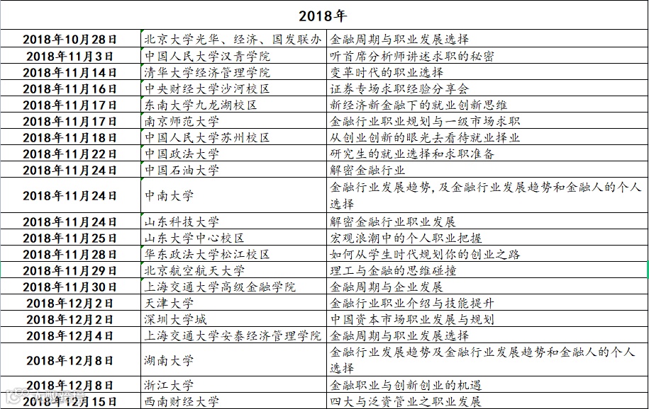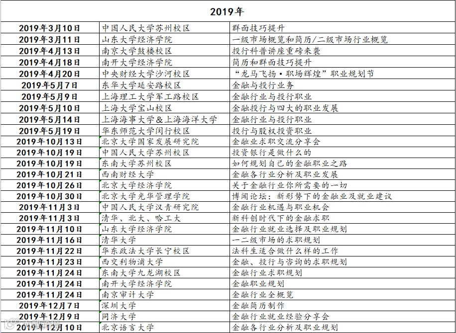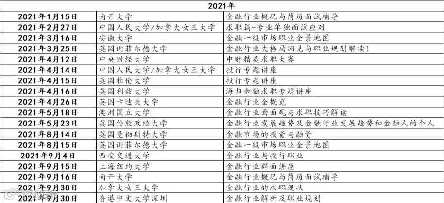 下表为2018年~2021年金融小伙伴在各大高校举办的线上、线下求职分享讲座: