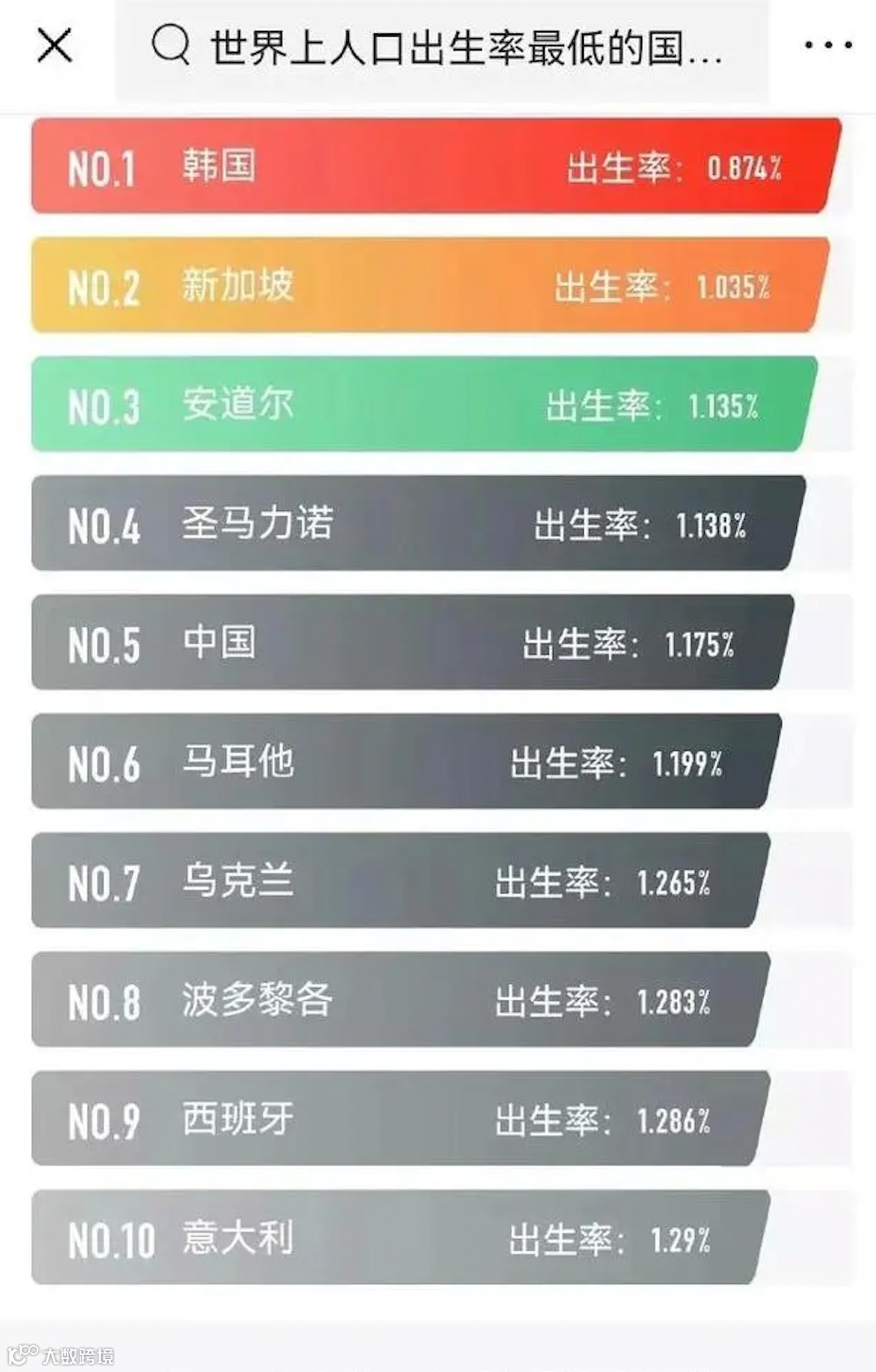 从图中可以看出中国的生育率已经非常低了,排到了全球第五名,如果把前面那两个不知名的小国家去掉我们可以稳拿甚至第三名。这形态已经非常严峻了。
