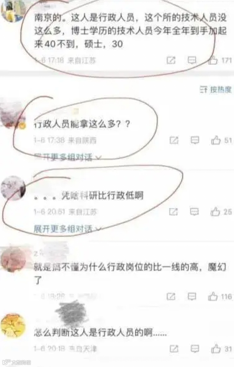 更重要的还是科研单位,没啥技术的行政人员,工资居然是科研人员的2倍还多。