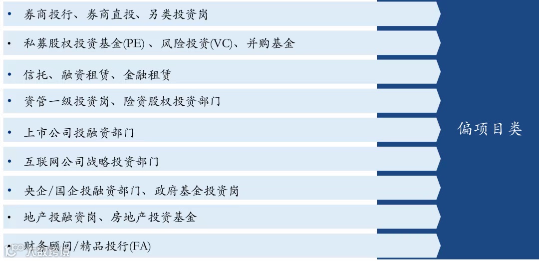 租赁、资管一级投资岗、险资股权投资部门、企业投融资部门、上市公司投融资部门、央企 / 国企投融资部门等。
