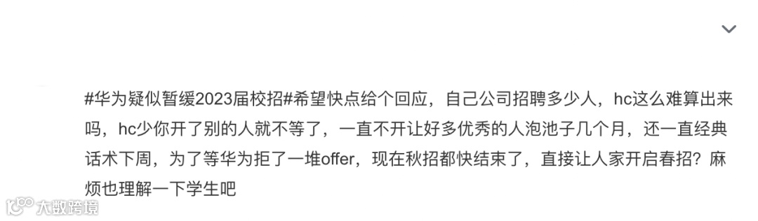 这个消息引起了不少参与华为校招的本硕学生的讨论,不少人自发地想把" 华为疑似暂缓校招 " 顶上热搜。