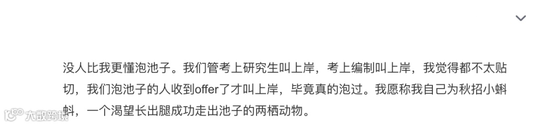 是没人比我更懂泡池子了,现在大家管考上研究生的叫上岸,考上编制的叫上岸,我觉得不够贴切,我们这群在池子里泡着的人收到了offer才叫上岸,毕竟已经泡了那么久,我愿称我们叫小蝌蚪,一个渴望长出腿成功走出池子的两栖动物了”。