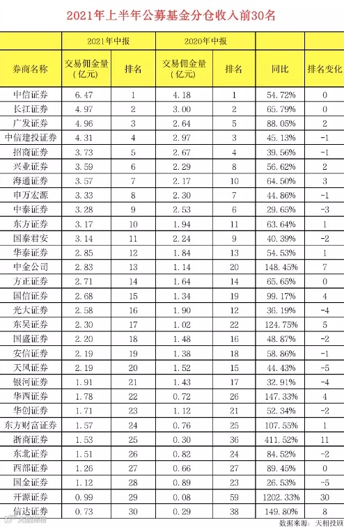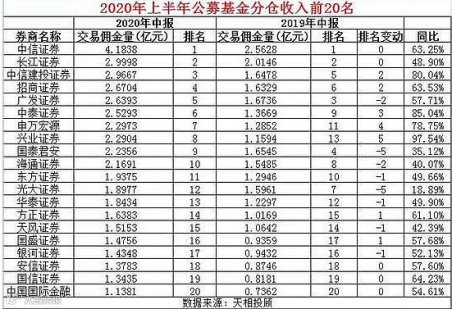 在公募股票交易量大增的半年中,有的券商借机实现快速发展。具体来看,有24家券商的基金分仓佣金收入实现翻倍。