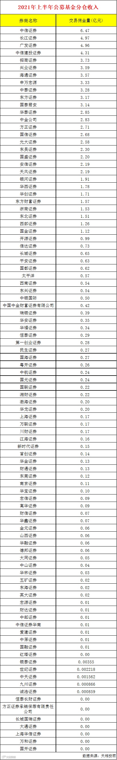 整体来看,仅仅上半年就有28家券商的基金分仓佣金收入超过1亿元。其中,中信证券以6.47亿元的基金分仓佣金收入位列第一,长江证券、广发证券、中信建投证券等的基金分仓佣金收入都在4亿元以上。