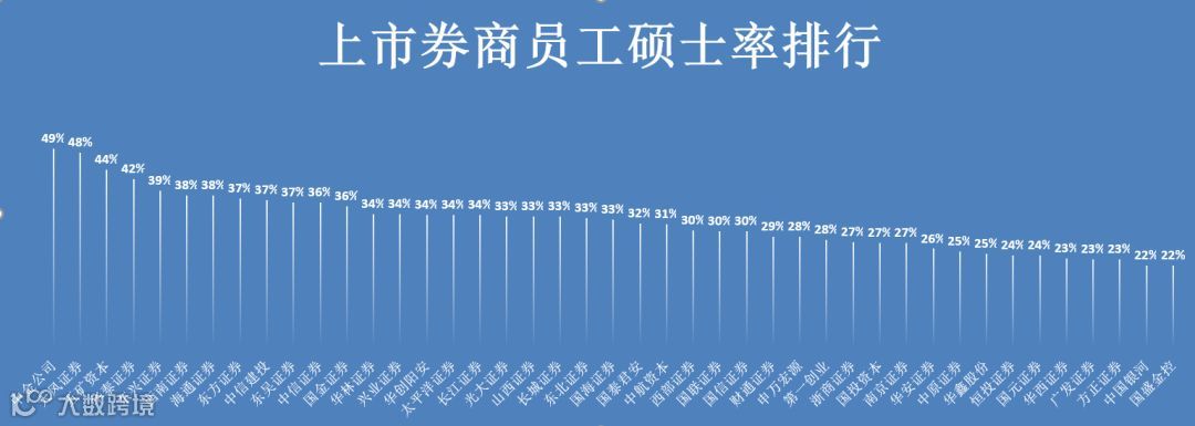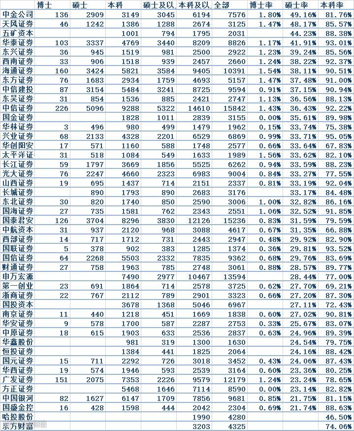 在我们熟知的中信证券、中信建投、海通证券、光大证券、申万宏源、国泰君安广发证券等大型券商中,硕士率都在35%以上,且本科率也都在90%左右。