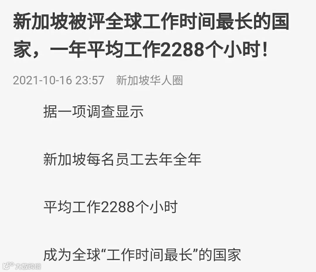 平均年工作时间上,新加坡排名第二,为2288小时,墨西哥以2255小时位居榜首,仅比新加坡高17个小时,中国以2174 名列第三。