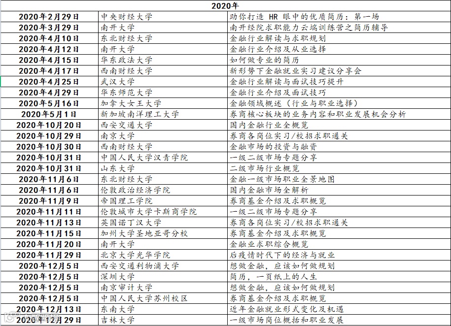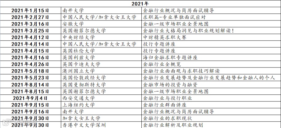 下表为2018年~2021年金融小伙伴在各大高校举办的线上、线下求职分享讲座: