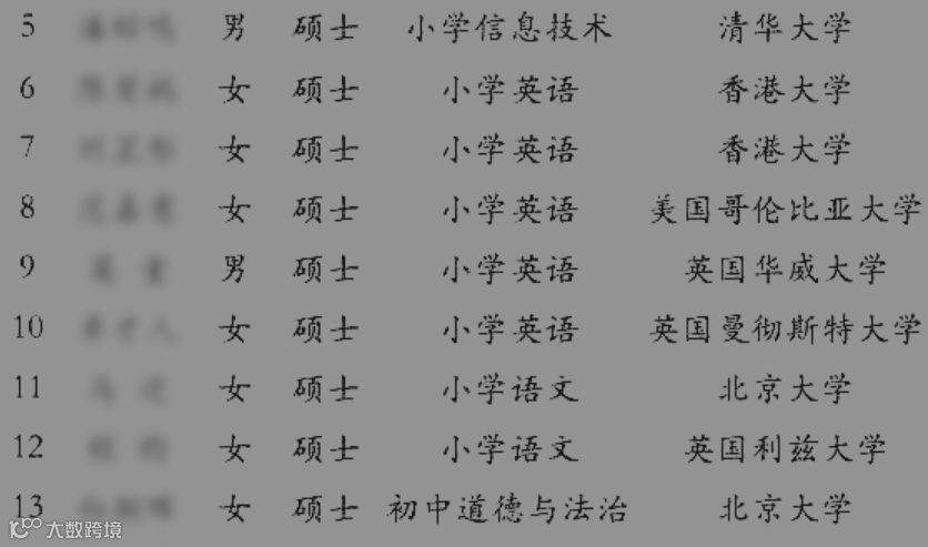 还可以看到,来自于哥伦比亚大学的硕士,教小学英语;来自北大的博士,教初中数学。