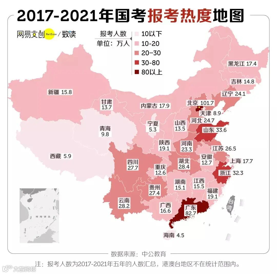 根据网易文创的数据显示,广东省的国考报考热度远远超过了山东,南方的浙江、湖北、云南、贵州的报考热度也超过了北方许多地区。
