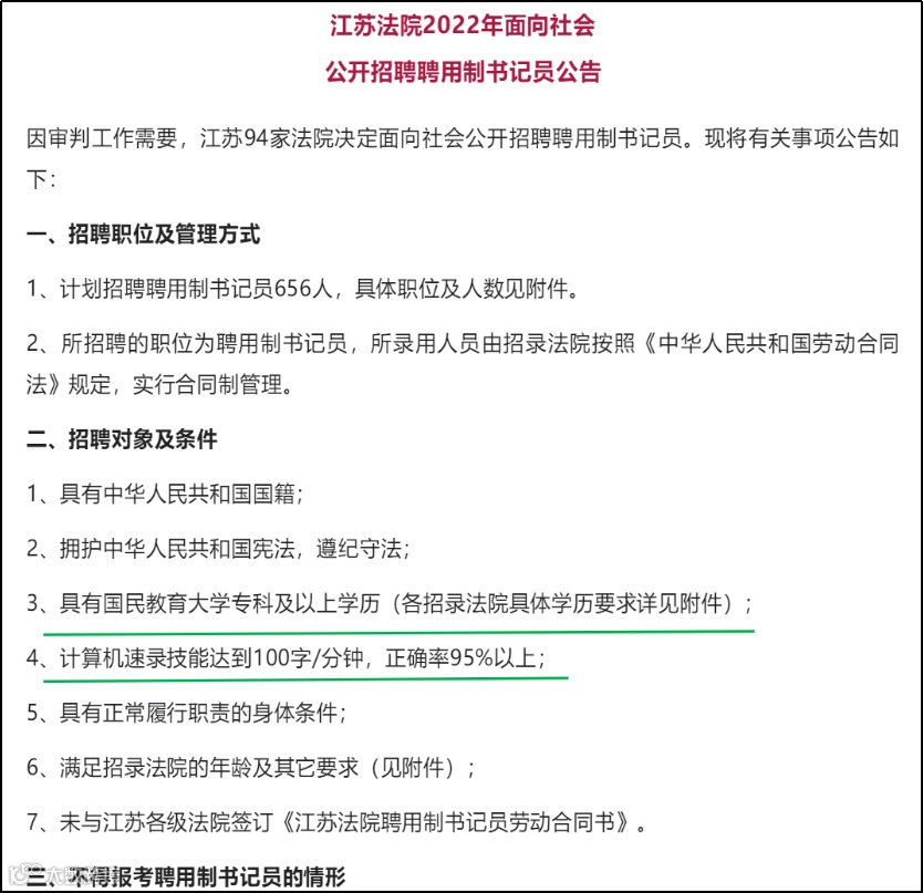 网上有相似的。不久前,江苏全省法院招聘聘用制书记员656人,学历要求是专科及以上。
