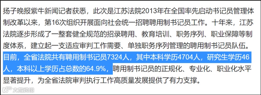想必里面包括干了很久的大专学历的老员工,所以可以推测,近年来被聘用的本科以上学历的书记员占比会远远超过六成。