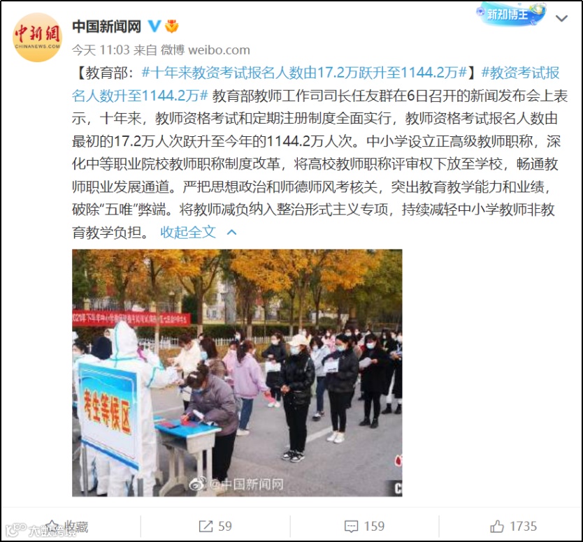 十年来教师资格考试报名人数由17.2万人次跃升到1144.2万人次。