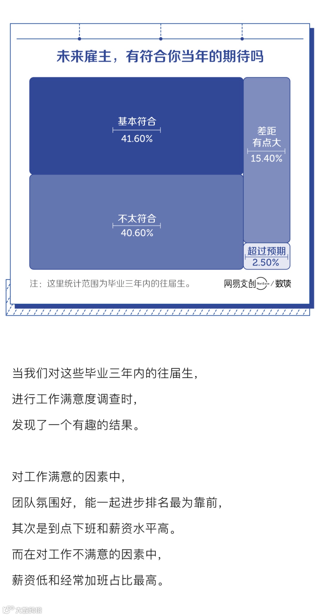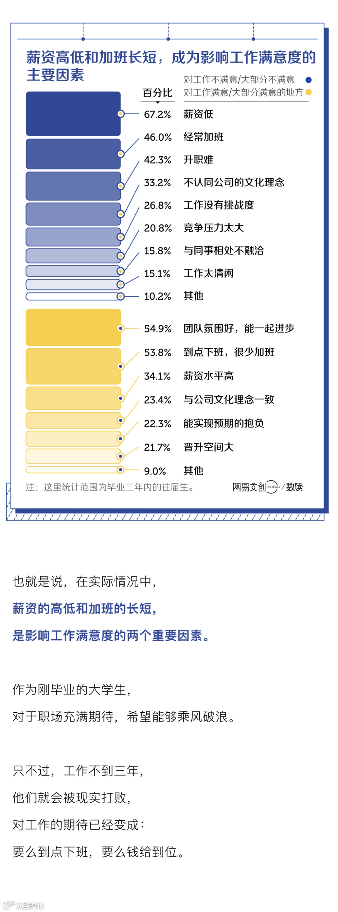 7、对那些工作三年内的毕业生,薪资和加班时长是影响工作满意度的重要因素。