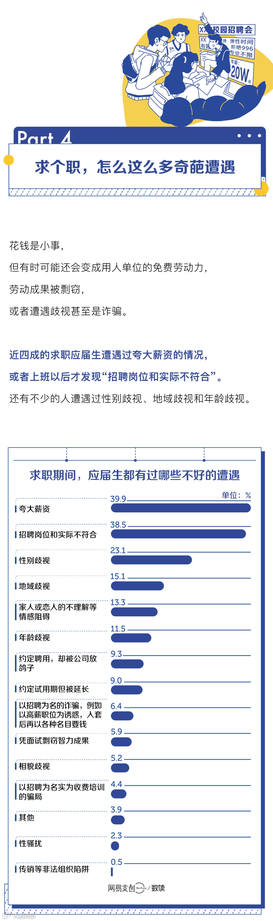 4、将近四成的求职应届生遭遇过薪资被夸大,以及“招聘岗位和实际不符合”的情况。