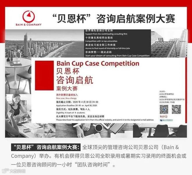 比如说像挑战杯做创业项目,实际上是启蒙你们商业思维的一次很好的机会。又如贝恩杯或其他咨询公司组织的案例分析比赛,是非常好的锻炼你们的构建逻辑、搜集信息、行业研究、呈现观点、英语、效率等多方面能力的机会。