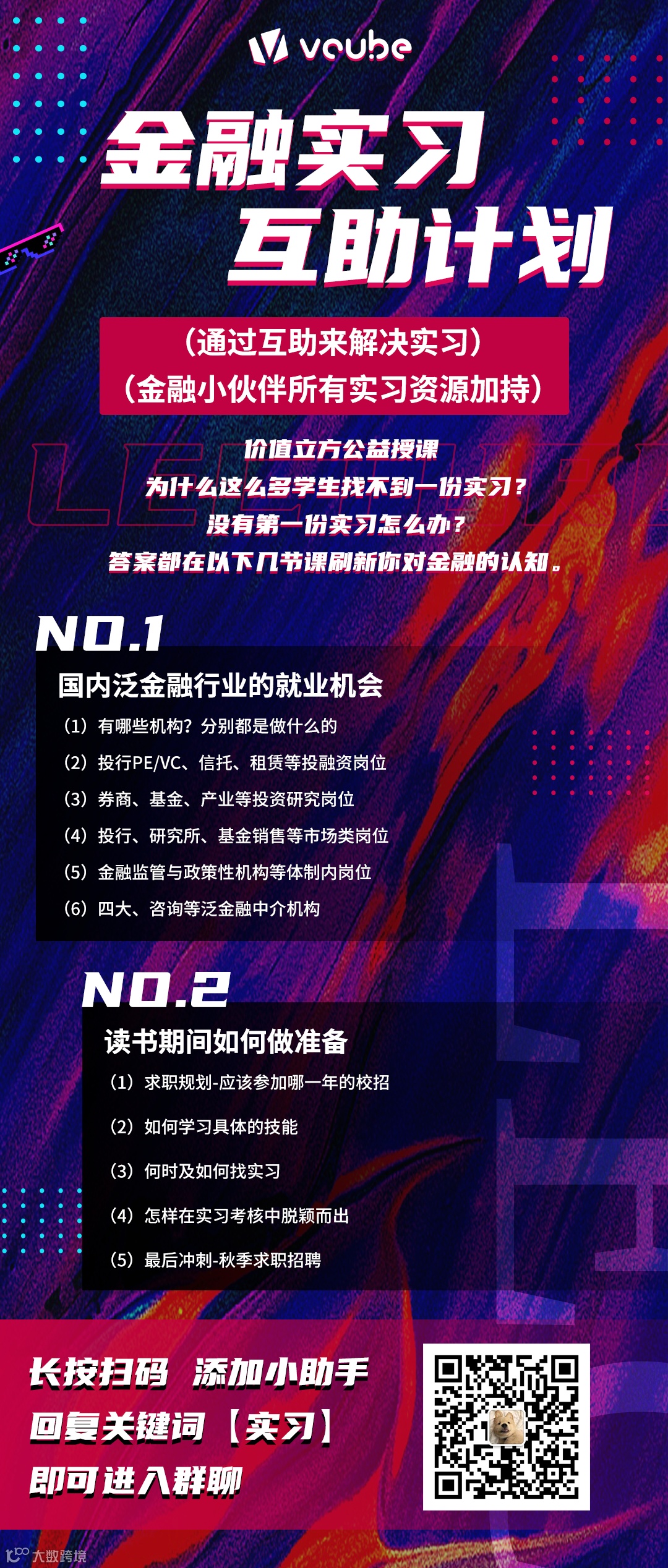 金融小伙伴致力于搭建一个金融垂直领域职业信息分享和交流公益平台,通过持续不断的公众号推文和线上线下活动,提供及时、全面、高效的行业招聘信息和职场提升经验。目前,我们已吸引了超过100万粉丝,在海内外金融学子和在职人士中均享有盛誉。