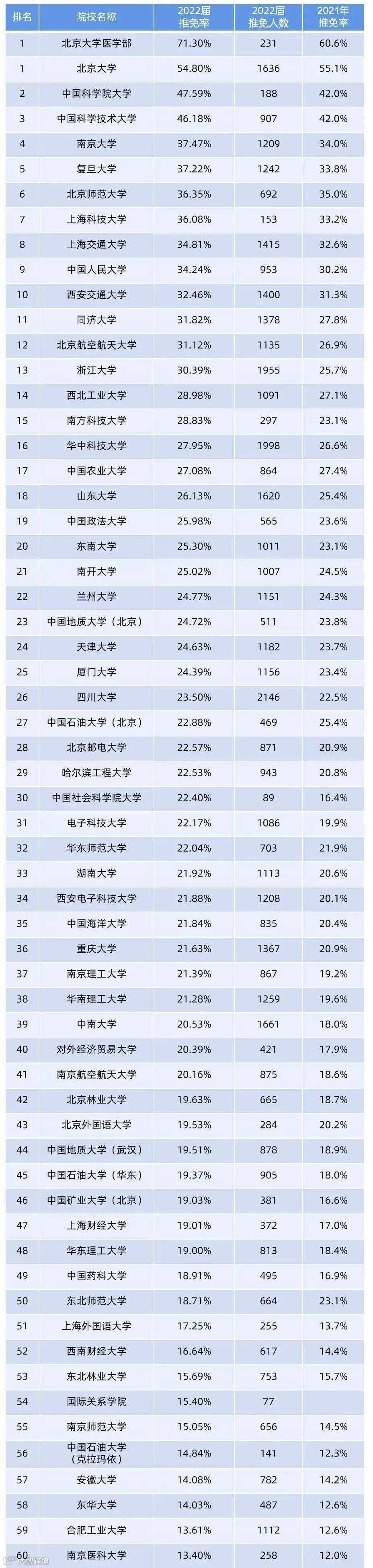 985高校的推免率都非常高,其中北京大学以54.8%的推免率位居榜首,中国科学技术大学、南京大学、北京师范大学、上海交通大学、中国人民大学、复旦大学、西安交通大学、同济大学、浙江大学等国内顶尖高校推免率均超过30%。