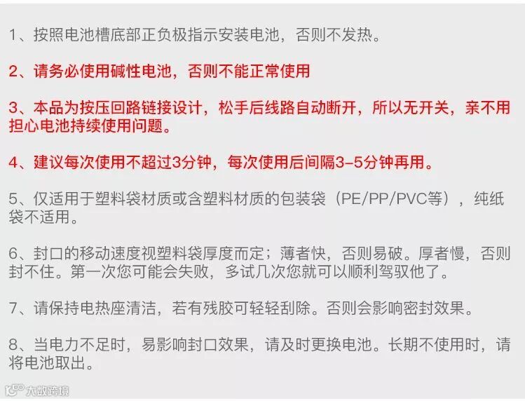 首先,电池一定要选择5号的碱性电池!其次就是按照正负极指示安装~当电力不足的时候,会影响到封口效果,因此就要立刻更换电池,木子建议不用的时候,尽量把电池取出来哦~