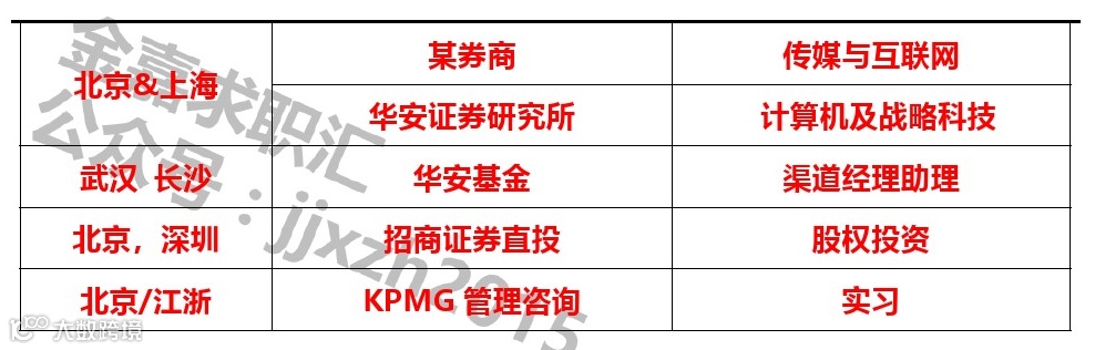 2、有投行、四大、VC/PE、金融、券商、咨询实习经验优先;