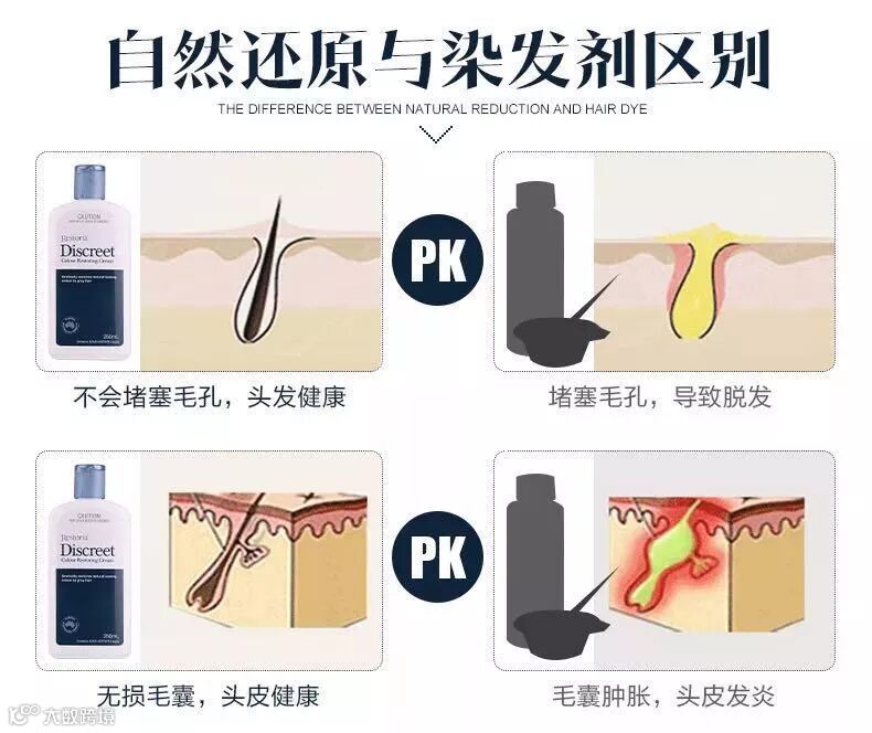 不同于一般染发剂如染布的色素一样,把每一根头发染作同一色泽。Restoria的黑发原理是:深入发根打开毛鳞片,填补毛鳞片中缺失的黑色素,从而达到白发变黑发的效果。