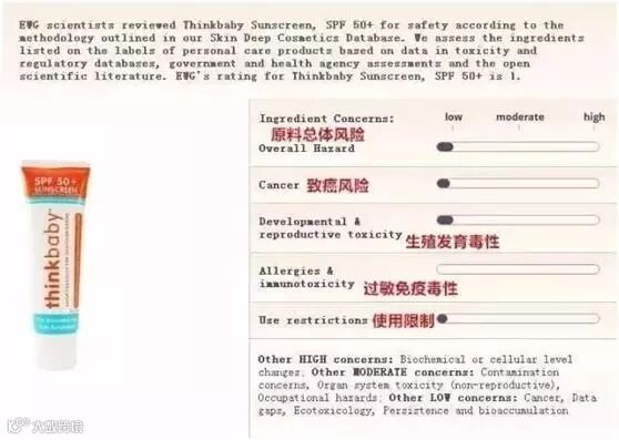 所以物理防晒对宝宝来说一方面起到了很好的防晒作用,另一方面对于宝宝皮肤更有益,对于有太多的化学物质会影响宝宝的健康成长了,Thinkbaby做到了真正的对毒物质SAY NO!我们来看一下EWG的毒性评测报告。