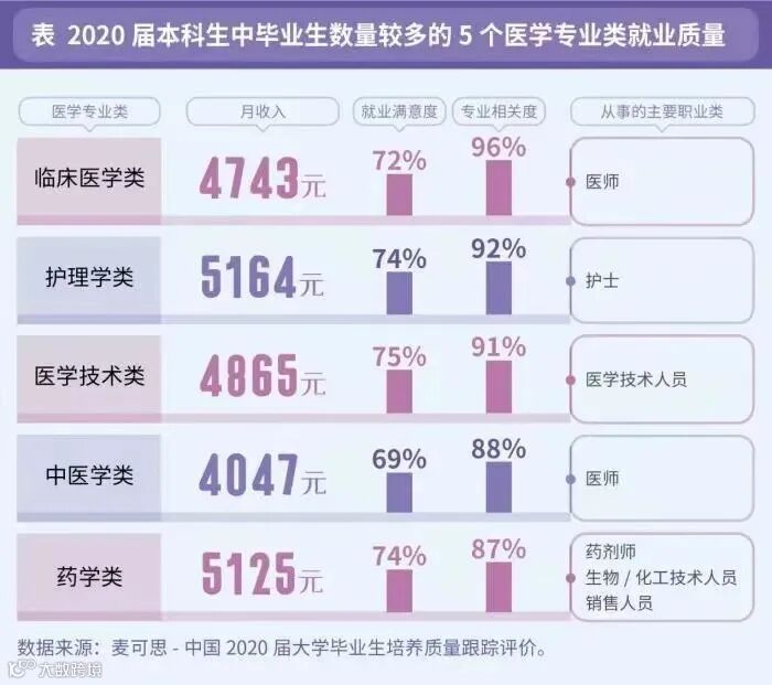 接下来是医学专业类,对于刚毕业的学生来说,护理学类的毕业生薪资是高于医学其他类的,主要是护理学专业对学历要求相对于其他几个类来说,要求较低。而其他几个医学类专业,尤其是临床医学类,对学历要求是相当高的,本科毕业生从事临床医学,在薪资方面是没有优势的,但是本科读完继续往更高的学历研读,工资往往会远远超过其他医学类专业。