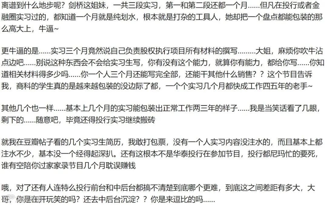 这里我也可以说一说,比如四个导师中其中一位比较护着留学背景的女士,拜托这是2021年的中国了,你逮着个ABC就稀罕的不得了,不知道是想显示自己的英语水平呢还是与众不同的留洋背景呢?大可不必,连WACC和FCF都答不出来的人,有没有一点诚意?面投行你起码投行四百问得烂熟于心吧?