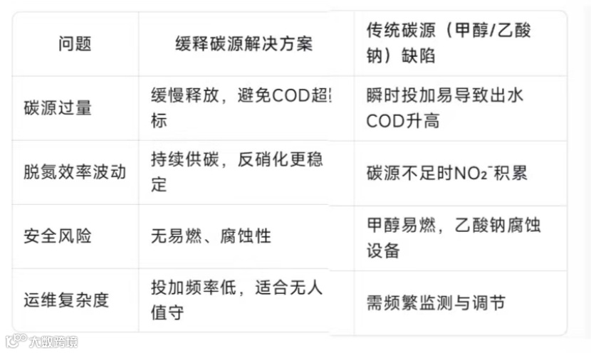 降低出水COD超标风险(传统碳源易因过量投加导致COD升高)。减少污泥产量(部分缓释碳源可被完全降解)。