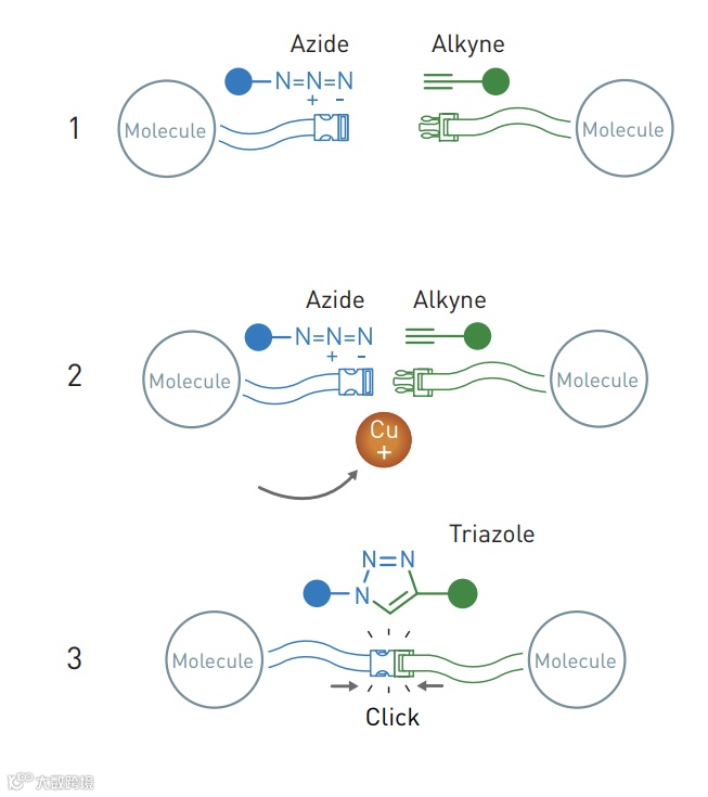 当铜离子加入后,叠氮化物和炔烃的反应变得极为高效。这种反应现在被广泛应用,来以简单的方式将分子连接在一起。