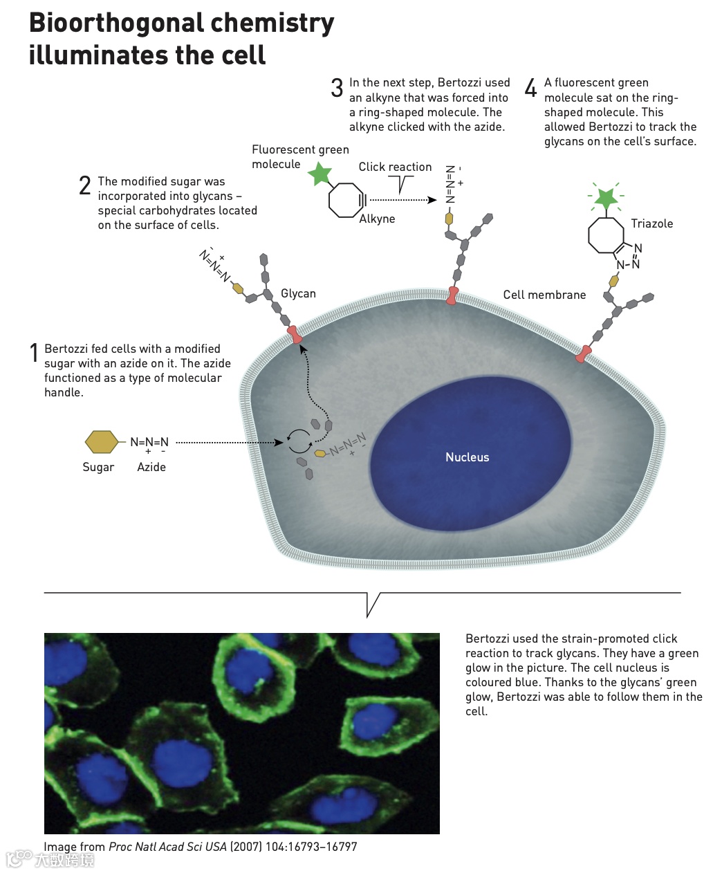 当她在细胞中进行测试时,反应效果很好。2004年,她发表了无铜点击反应,命名为应变促进炔叠氮化物环加成(strain-promoted alkyne-azide cycloaddition),然后证明了它可以用来追踪多聚糖(见上图)。
