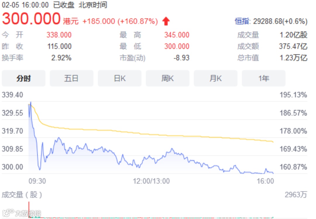 股价开盘上涨193.913%,报338港元,此后略有回调,最终收于300港元,涨逾160%,总市值达到1.23万亿港元,成为港股第10大市值公司。