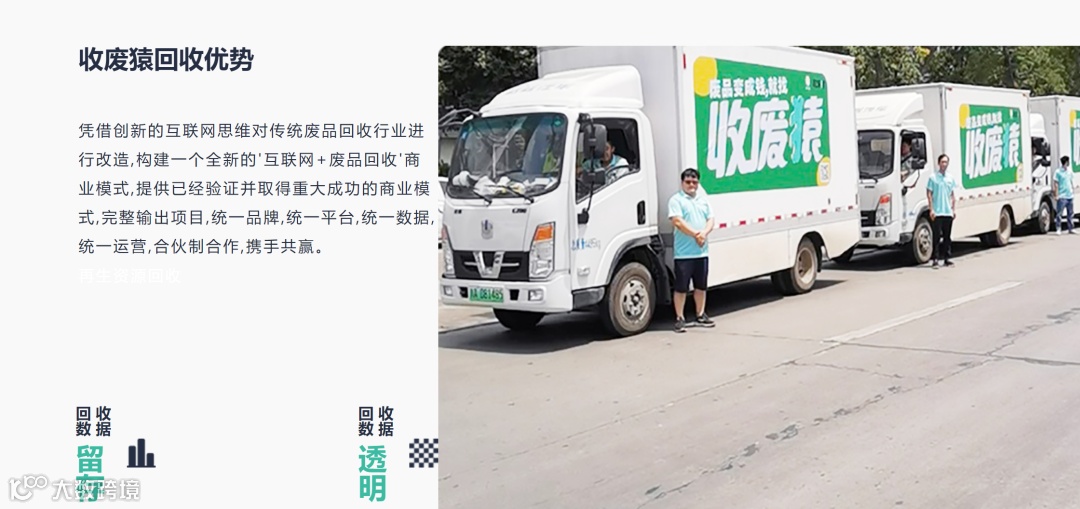 网上搜索“收废猿”网站可以看到,“收废猿”是一家以加盟为主的公司,网站关键词包括“再生资源回收公司加盟、回收加盟、废品回收公司加盟”,而公司成立时间不到一年。换句话说,加盟费才是真正赚钱的环节。