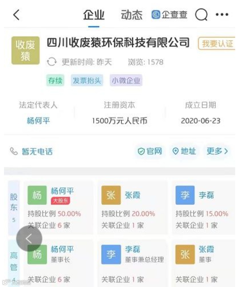 通过 @企查查 一看资本还不少,人家是一家有1500万资金的新创立不久的环保企业。