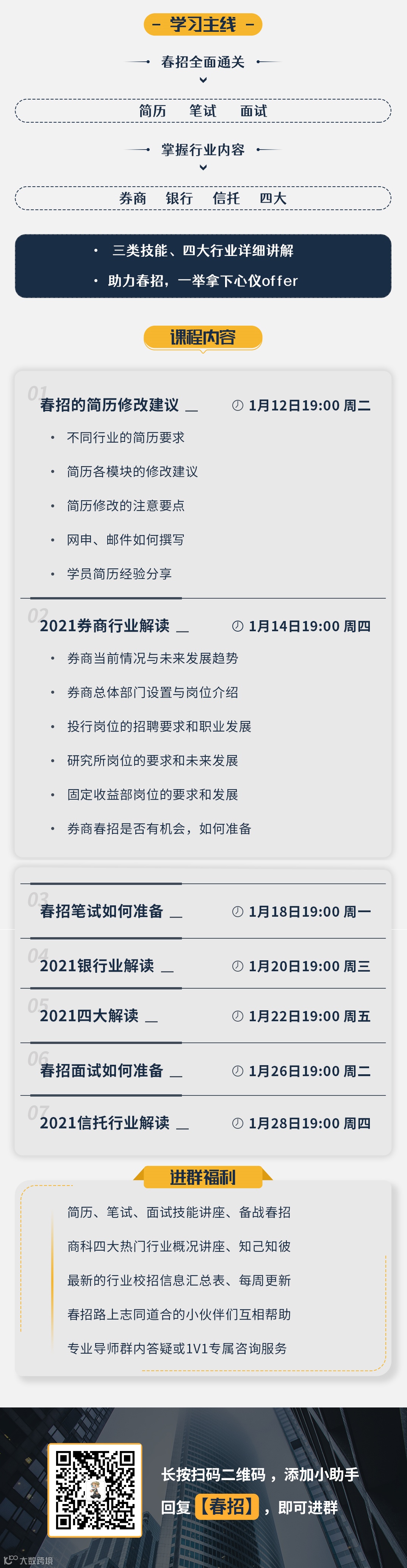 此外,将为您解读券商、银行、信托、保险、四大、咨询各行业未来发展趋势、招聘要求、职业发展等,有助于你做出正确的职业选择。