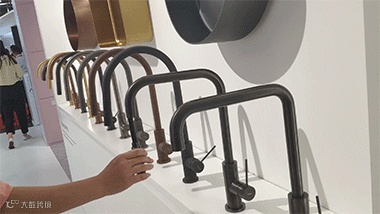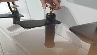 这款龙头,将形状与颜色碰撞出了新观感。直圆柱与扁平体相交的龙头,搭配圆形把手,尽显不规则个性美。而金色与黑色的混搭,给人予轻熟的稳重感。