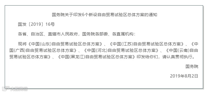 日前,国务院印发《中国(山东)、(江苏)、(广西)、(河北)、(云南)、(黑龙江)自由贸易试验区总体方案》。
