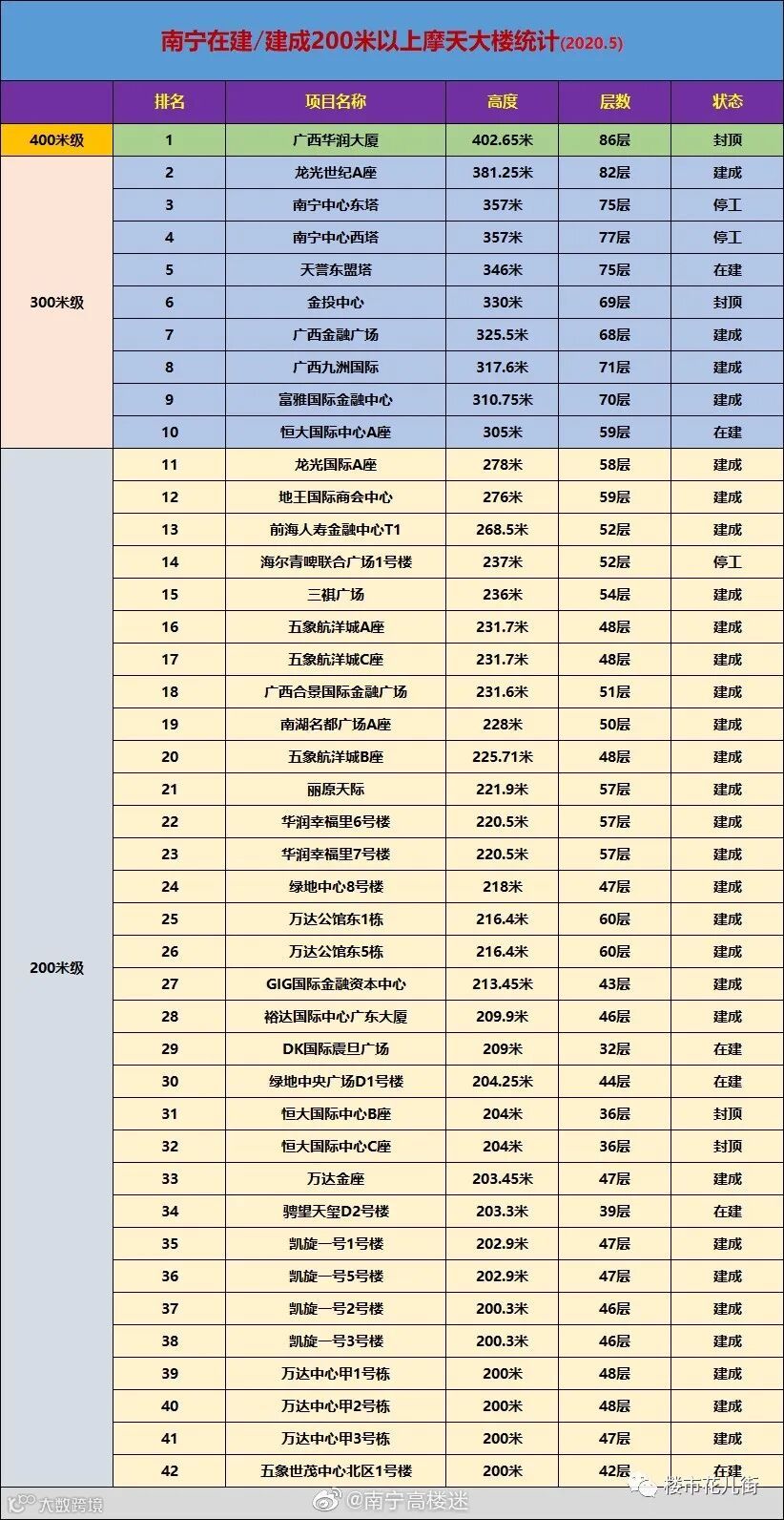 据统计,南宁目前200米以上的住宅和写字楼超高层多达42座。其中400米+一座,300米+的超高层总共10座,200~300米的超高层就多达32座。这些超高层项目,基本上也比较集中,主要是分布于东盟商务区和五象总部基地。