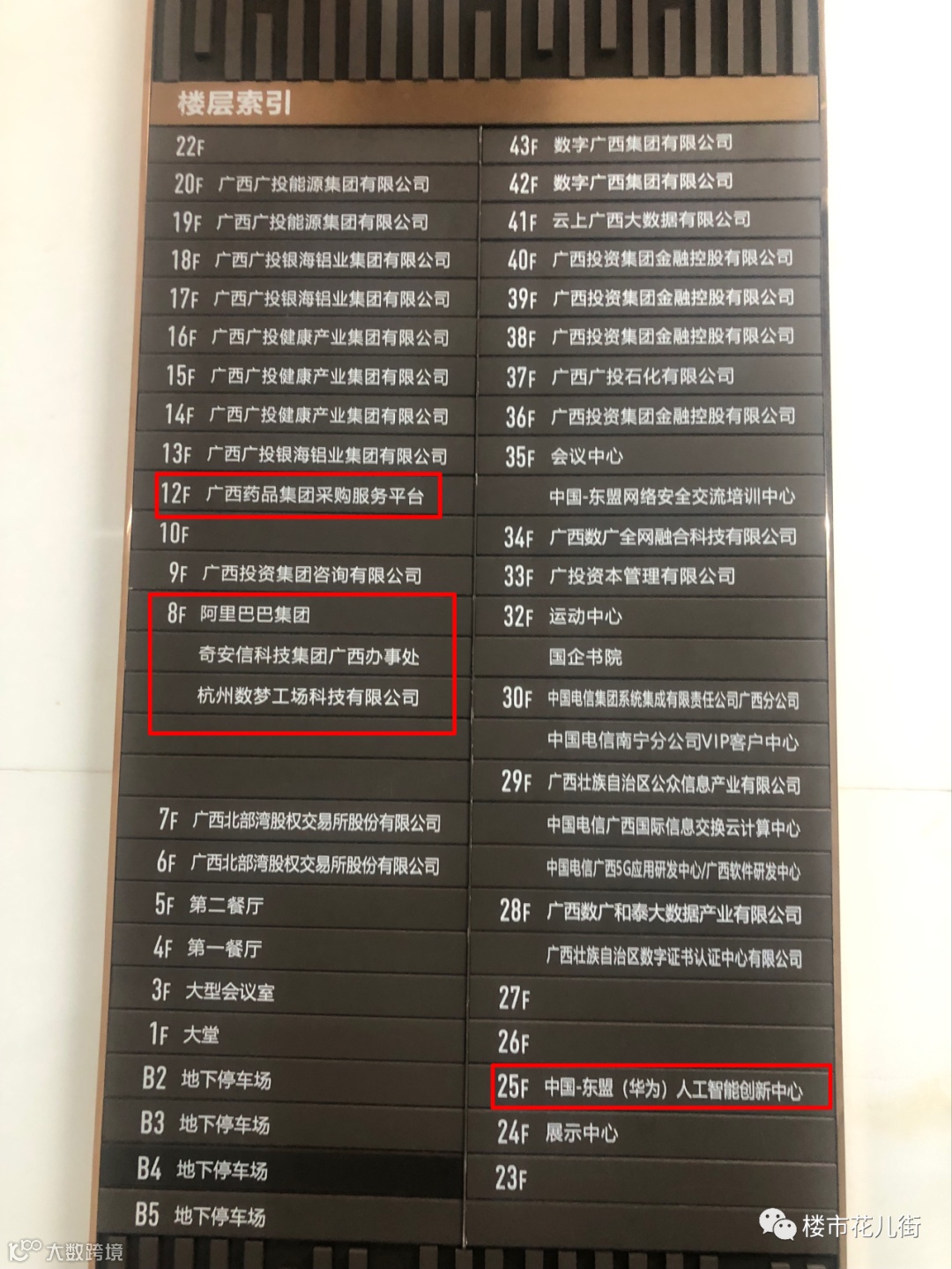 这是五象新区中国东盟金融城里的写字楼GIG的进驻企业,可以看到华为人工智能创新中心、阿里巴巴的办事处都已经进驻。