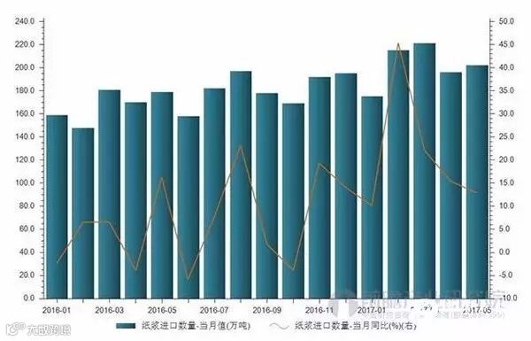 数据显示,2017年5月我国纸浆进口202万吨,当月同比增长12.85%;1-5月纸浆进口量累计1010万吨,累计同比增长20.81%。