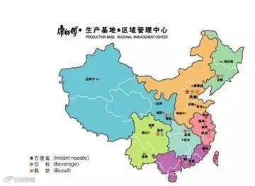 据公开资料称,康师傅全国生产基地分为7个大区,一是东北区,区域中心在沈阳;二是华北区,区域中心在天津;三是华东区,区域中心在杭州;四是华中区,区域中心在武汉;五是华南区,区域中心在广州;六是西南区,区域中心在重庆;七是西北区,区域中心在西安。