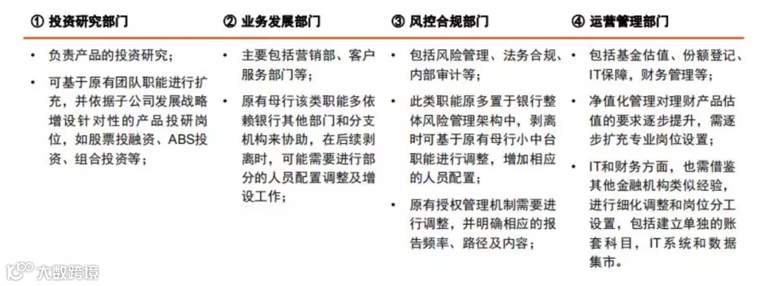 风险管理和控制则置于全行统一风险架构中,但独立子公司后,这些岗位很大程度上都需要增加人员配置,投研方面也有部分人才缺口,尤其是权益投资方面。