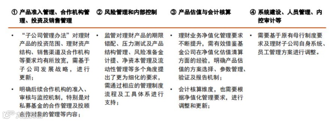 此前资管部门在银行体系内专注于产品和投资端,运营、系统、合规、销售这些内容都是由行内其他部门和分支机构来协助。