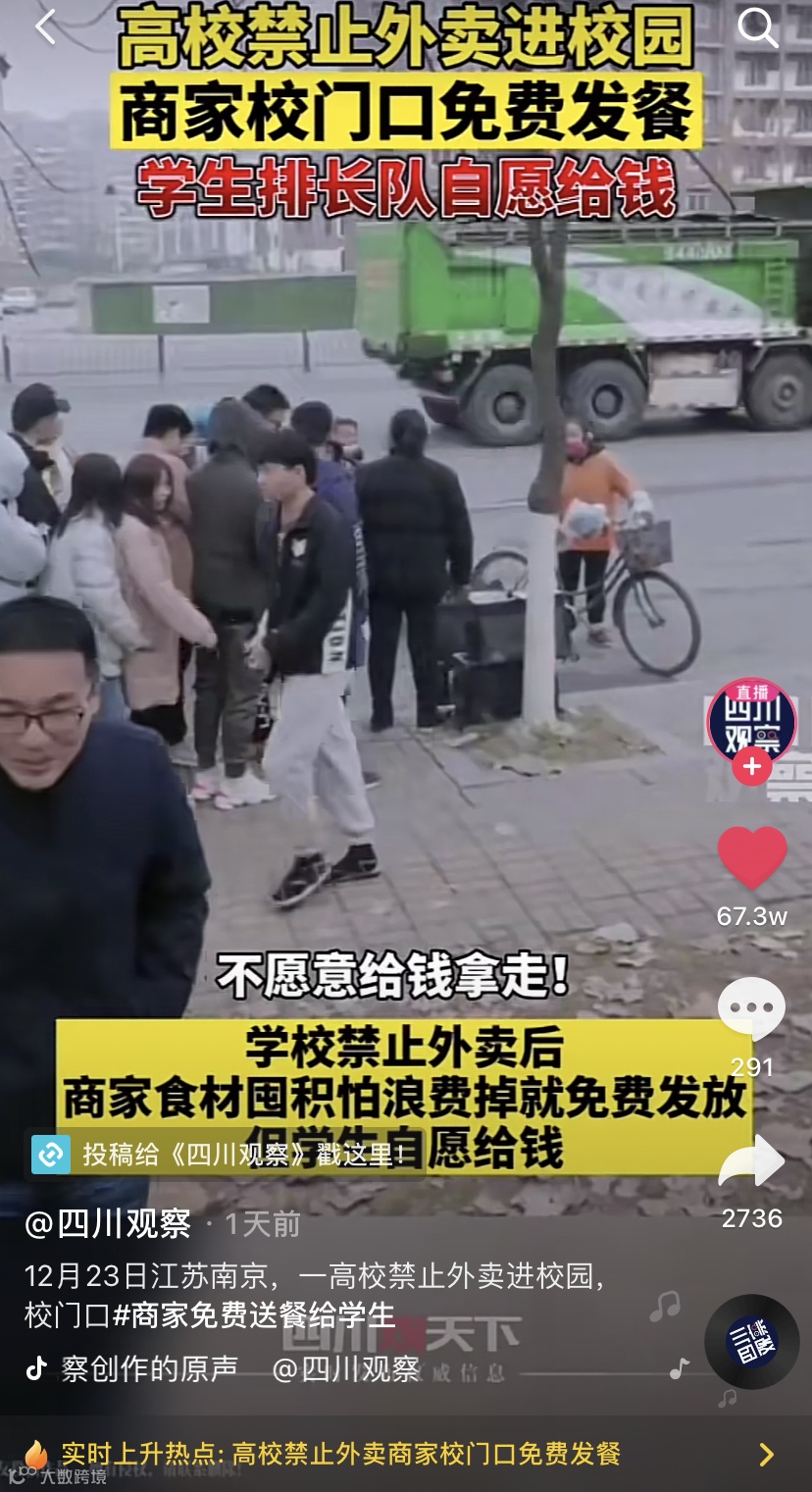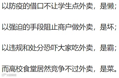 解决外卖问题明显有更好的方法,比如食堂菜价降一半,伙食补贴翻两番,提高食堂饭菜质量。
